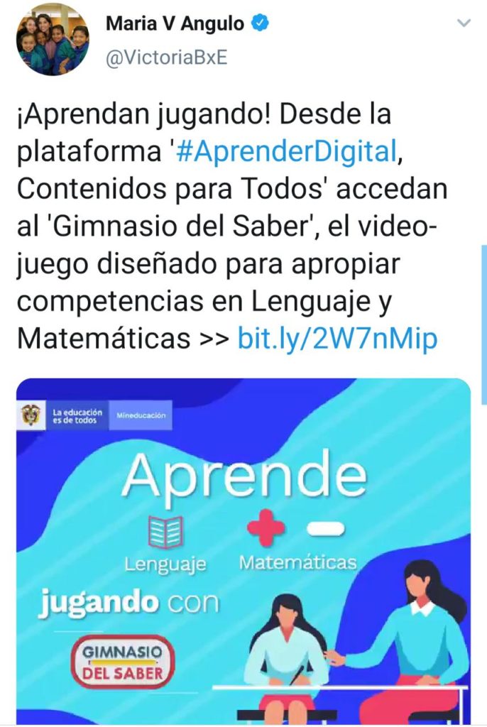 ¡Aprendan jugando! Desde la plataforma #AprenderDigital Contenidos para todos accedan al Gimnasio del saber, el video-juego diseñado para apropiar competencias en Lenguaje y Matemáticas. http://www.colombiaaprende.edu.co/concursovideojuego/inicio Enviar comentario Cancelar la respuestaTu dirección de correo electrónico no será publicada. Los campos obligatorios están marcados con *Comentario * Nombre * Correo electrónico * Web Δ Este sitio usa Akismet para reducir el spam. Aprende cómo se procesan los datos de tus comentarios.