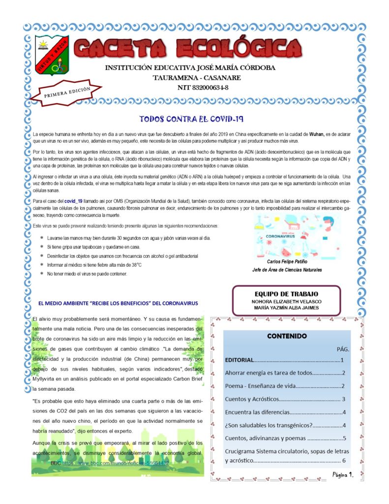 GACETA ECOLOGICA PRIMERA EDICIÓN AÑO 2020 INSTITUCIÓN EDUCATIVA JOSÉ MARÍA CÓRDOBA