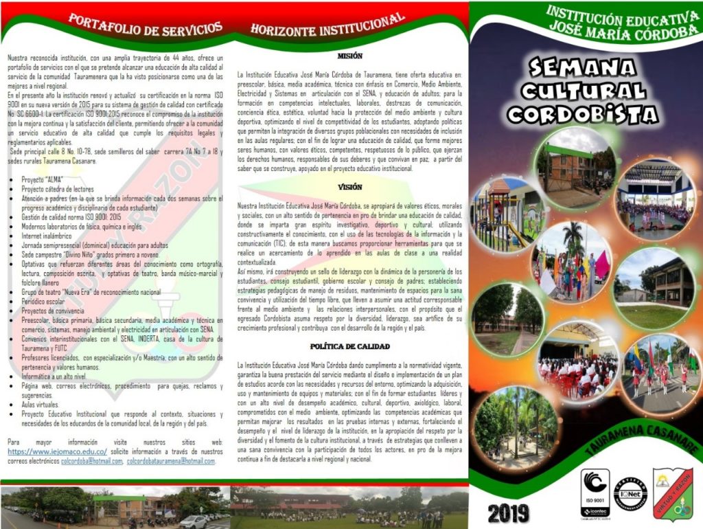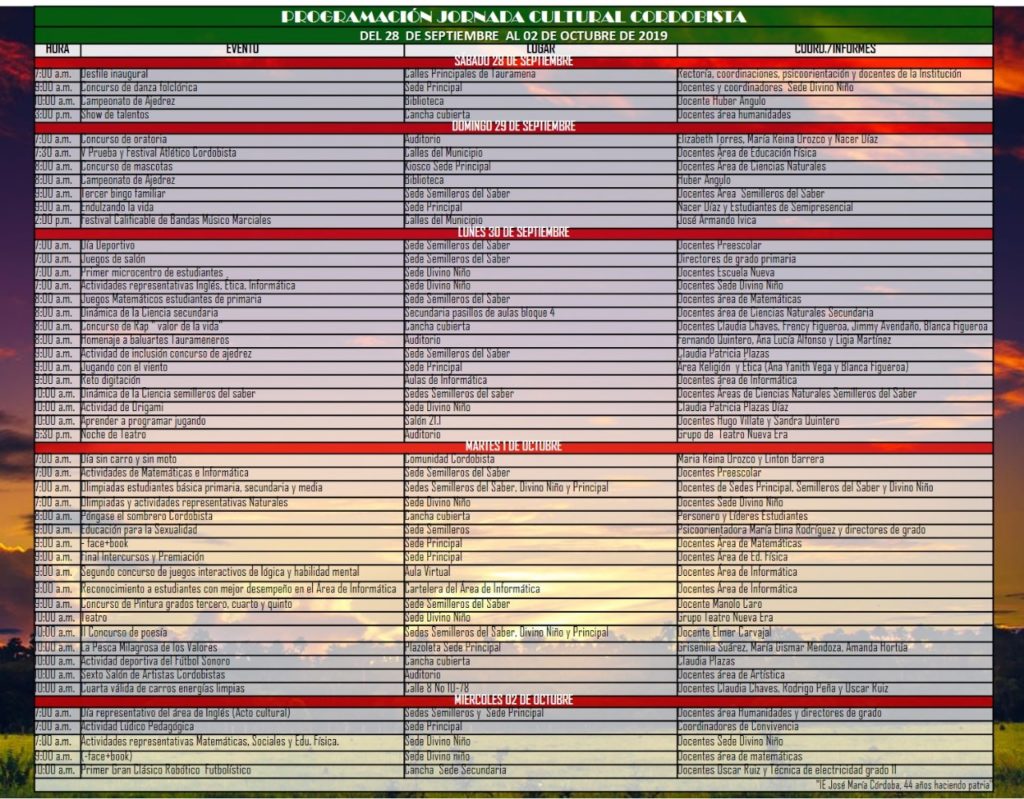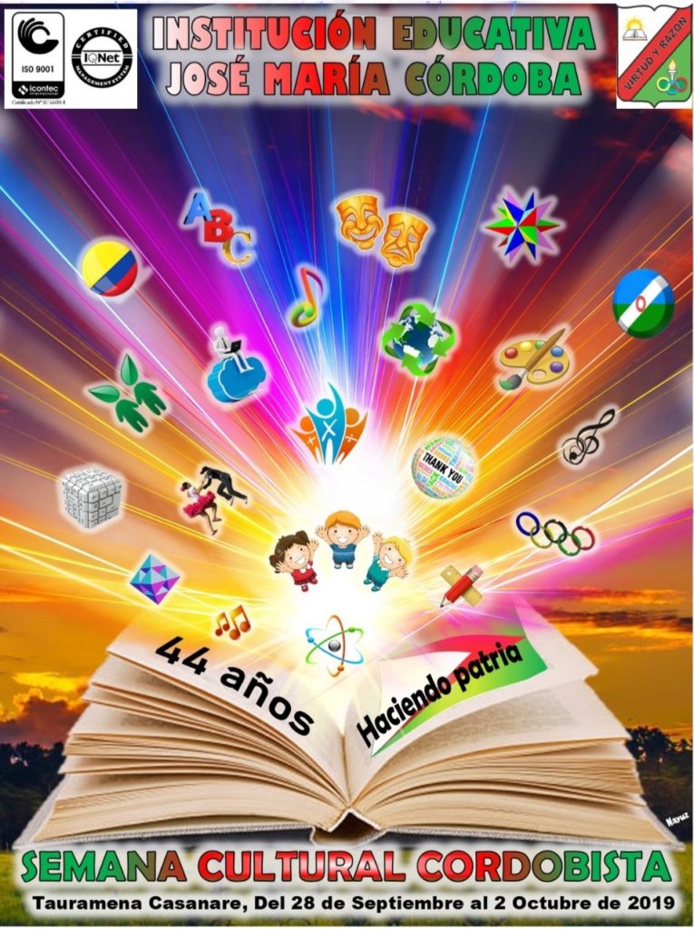 Semana cultural Cordobista del 28 de Septiembre a 2 de octubre de 2019 La Institución Educativa Jose Maria Cordoba tiene el gusto de invitar a la comunidad en general. Enviar comentario Cancelar la respuestaTu dirección de correo electrónico no será publicada. Los campos obligatorios están marcados con *Comentario * Nombre * Correo electrónico * Web Δ Este sitio usa Akismet para reducir el spam. Aprende cómo se procesan los datos de tus comentarios.